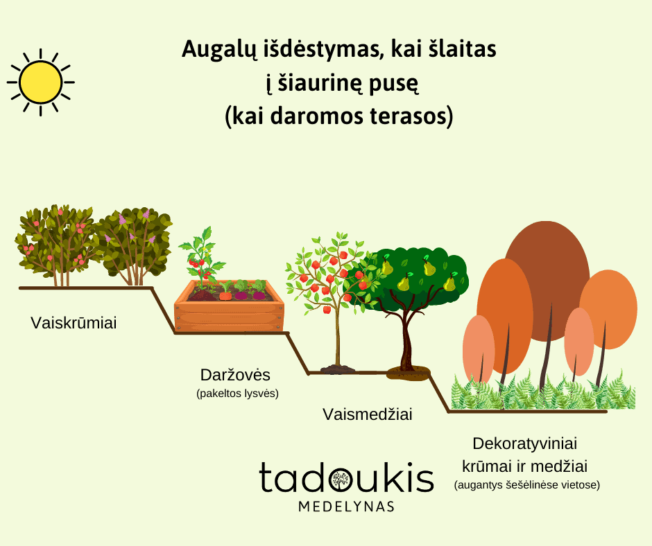 Augalų pasirinkimui įtakos turės ir tai, kokioje pusėje yra šlaitas. Pietinis šlaitas gauna daugiausiai saulės, tad čia drąsiai galima sodinti beveik visus augalus. Jų išdėstymą terasose darykite pagal augalų aukštį: viršutinėse terasose sodinkite aukštesnius, vidurinėse – vidutinio aukščio, o žemesnėje terasose tokius, kurie mėgsta drėgmę (pavyzdžiui, geltonžiedė sedula, serbentai).