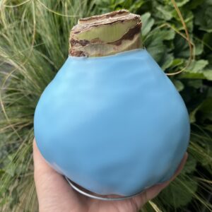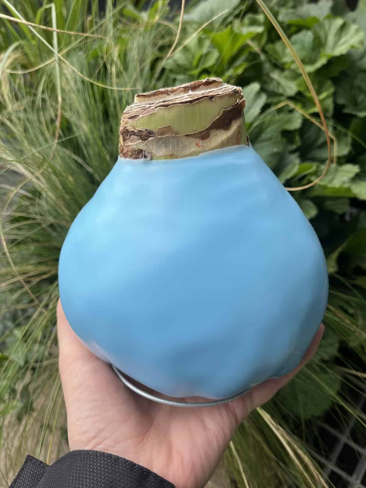Svogūnas aplietas vašku, spalva: Light blue. Turi pastatymui vielos atramą.