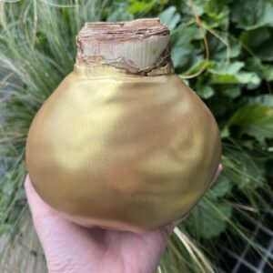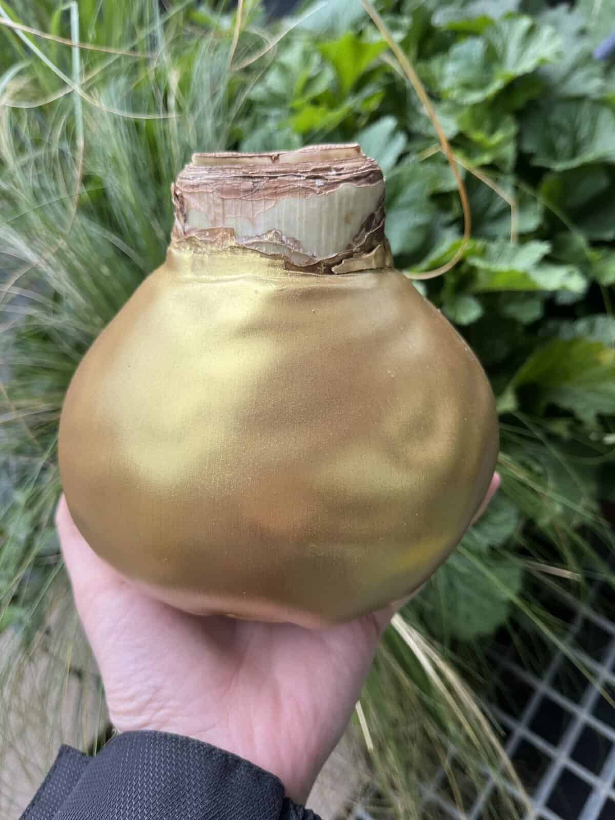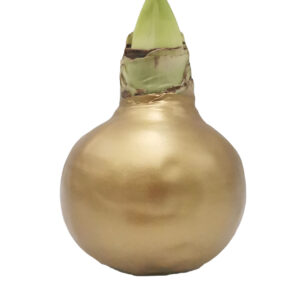Svogūnas aplietas vašku, spalva: metallic gold. Turi pastatymui vielos atramą.