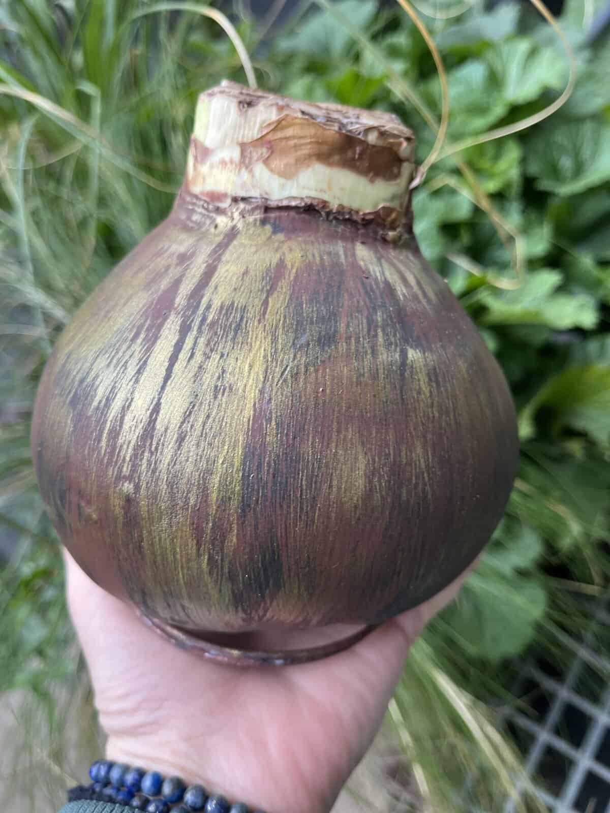 Ypatybės: svogūnas rankomis glazūruotas vašku, su metaliniu stoveliu, žydi be vandens ir žemės