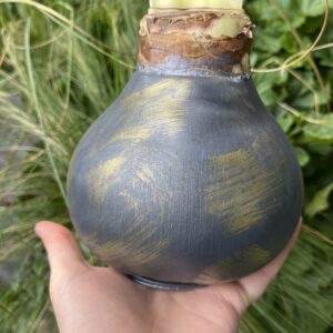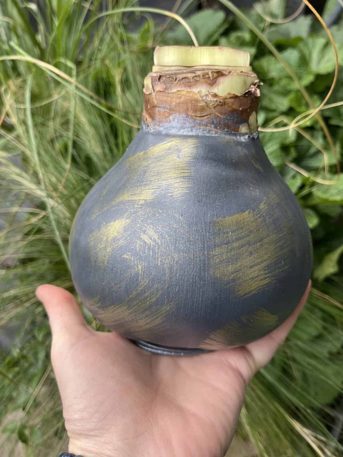 Ypatybės: svogūnas rankomis glazūruotas vašku, su metaliniu stoveliu, žydi be vandens ir žemės