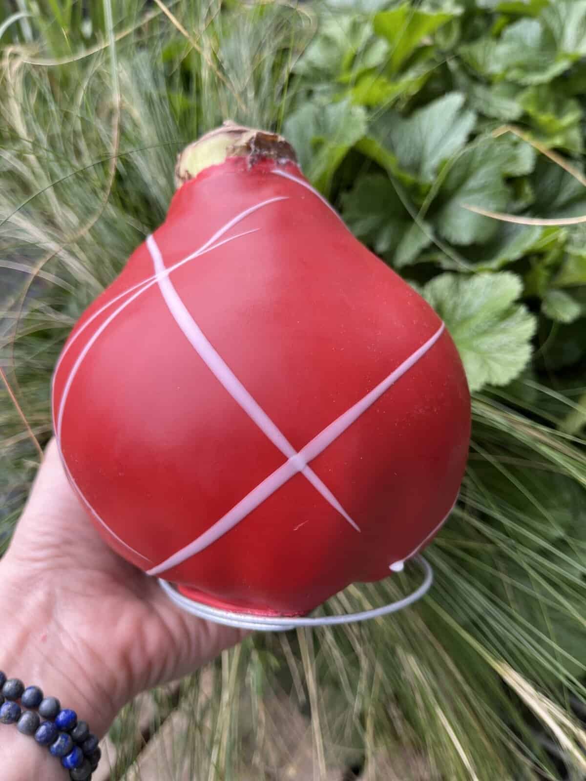 Svogūnas aplietas vašku, spalva: red line. Turi pastatymui vielos atramą.
