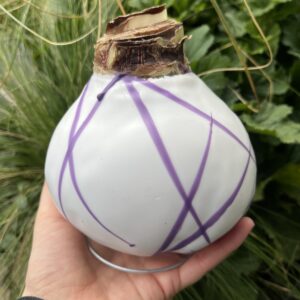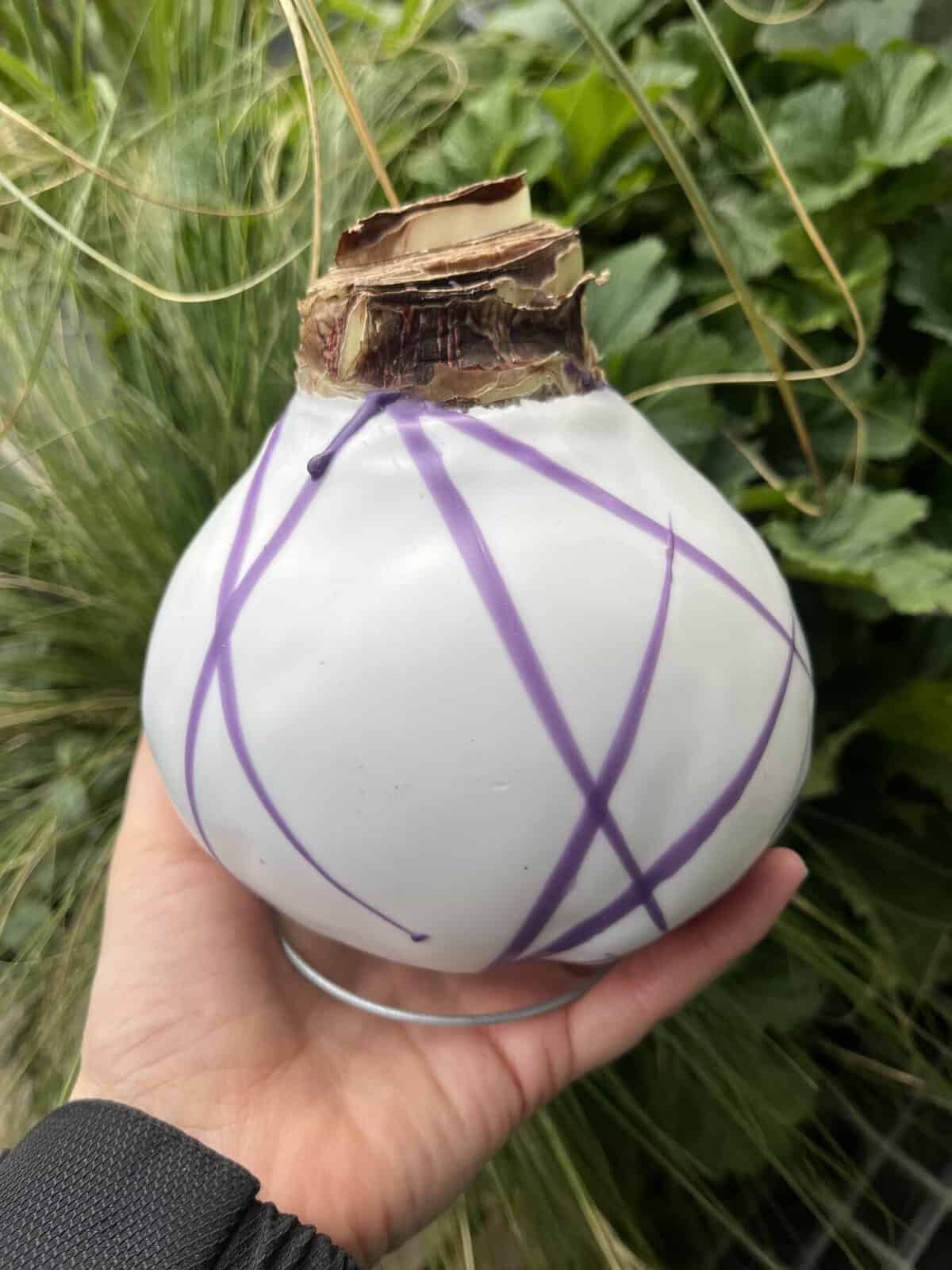 Svogūnas aplietas vašku, spalva: white line. Turi pastatymui vielos atramą.