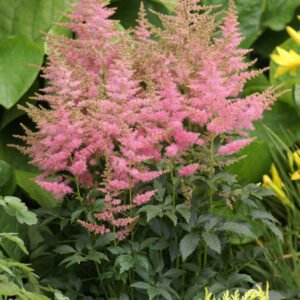Astilbė ‘Country and Western’ – tankus, žemas, lyg papartinių, žvilgančių lapų kerelis nuo vasaros pradžios pražysta šakotomis, puriomis, rausvai ryškiomis šluotelėmis.