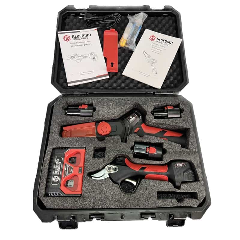 Blue Bird akumuliatorinių įrankių rinkinys skirtas genėjimui – akumuliatorinis sekatorius ir akumuliatorinis pjūkliukas. Patogiame lagamine, komplekte su akumuliatoriais ir įkrovėju.