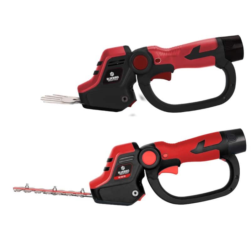 Nedidelės, rankinės akumuliatorinės žirklės su dviem keičiamais ašmeninis – žolei ir gyvatvorėms pjauti. Su vienu įrankiu nesunkiai apipjausite žolę vejos pakraščiuose ar aplink augalus, bei padailinsite savo gyvatvorę ar augalus. Tai praktiškas ir patogus įrankis atliekantis dvi funkcijas. Ergonomiška ir neslidi rankena leidžia suimti įrankį patogiai, o mažas svoris nenuvargins rankos. Galima naudoti su papildomu priedu – prailginimo kotu, kuris leis patogiai dirbti nesusilenkus.