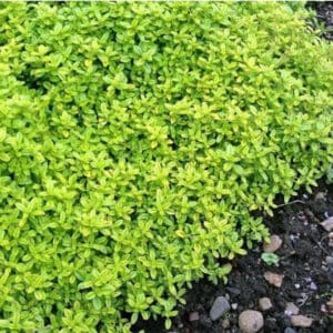 Lapai šviesiai žalsvi, gelsvi. Žiedai šviesiai rausvi, maloniai kvepia citrina. Mėgsta augti saulėtoje vietoje. Šis čiobrelis auginamas kaip dekoratyvinis augalas, naudojamas kaip amžinai žaliuojantis grunto dangalas soduose ir vazonuose.