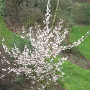 Žydi labai anksti – dar prieš išsiskleidžiant lapams. Šakos gausiai pasidengia smulkiais baltais, kartais švelniai rausvo atspalvio žiedais, kurie skleidžia malonų, primenantį migdolus kvapą. Dėl ankstyvo žydėjimo augalas tampa vienu pirmųjų pavasario akcentų sode.