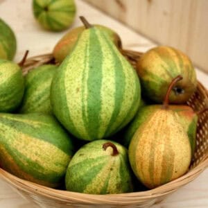 Vaisiai: vidutinio dydžio, gelsvai žali su ryškiomis raudonai žaliomis juostomis; minkštimas sultingas, saldžiarūgštis