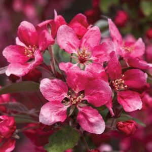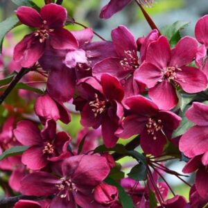 Vaisiai – tamsiai raudoni, smulkūs, daugiau primena stambias uogas, nei obuolius, nevalgomi. Vaisiai ant medžių laikosi ilgai, atrodo labai dekortyviai ir privilioja paukštelius.
