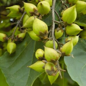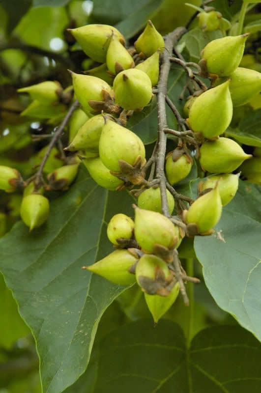 Lapai labai dideli, širdiškos formos, minkšti, švelniai plaukuoti. Jauni augalai gali išauginti ypač didelius lapus, ypač jei kasmet stipriai nugenimi.