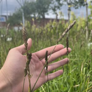 Žiedai (varpos): sidabriškai šviesūs, vėliau rusvi šluotelės