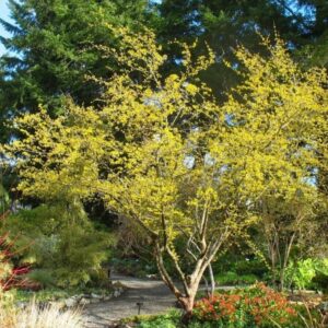 Krūmas ar nedidelis medis auga iki 3–4 metrų aukščio ir 2–3 metrų pločio, formuoja tankią, apvalią lają. Žydi labai anksti – kovo–balandžio mėnesiais, kai dar nesimato lapų. Ryškiai geltoni žiedai dengia šakas itin gausiai, todėl augalas atrodo tarsi auksinis pavasario debesėlis.